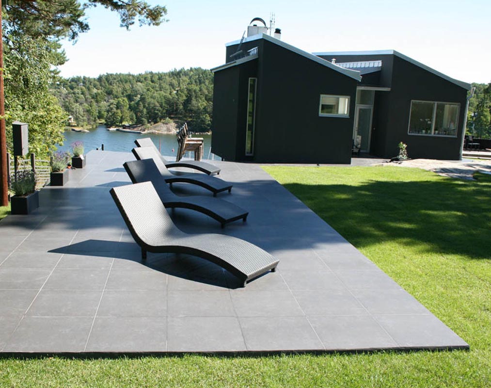 In the Swedish garden, the green grass is directly laid with the Weige 2CM thick rough stone series product GP006, which is combined with the streamlined stone beach chair with the same texture, making it simple but comfortable to enjoy the afternoon garden.